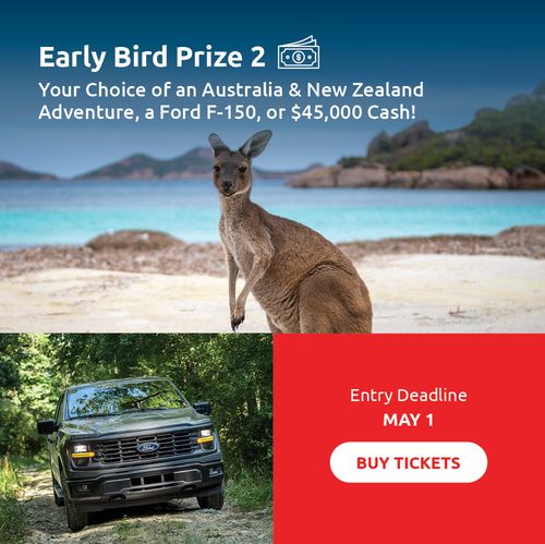 Buy your tickets early for extra chances to win! When you purchase before the deadline, your tickets are re-entered into Early Bird 1, Early Bird 2, and the Grand Prize drawings.