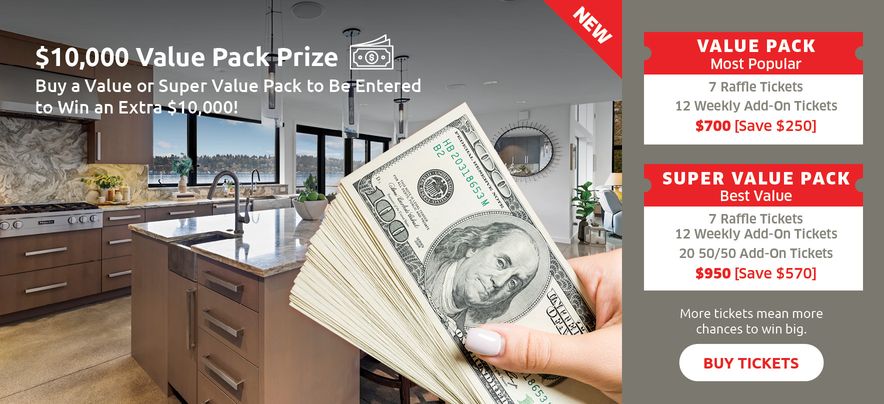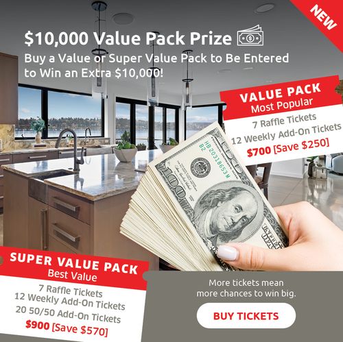 Buy a Value or Super Value Pack to save money and you'll automatically get entered into our new Value Pack Drawing for a chance to win an extra $10,000! Every main raffle ticket in an order containing a Value or Super Value Pack counts as an entry—so with an order containing a Super Value Pack and a 3-pack of main raffle tickets, you get 10 Value Pack Drawing entries!